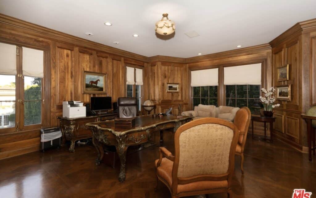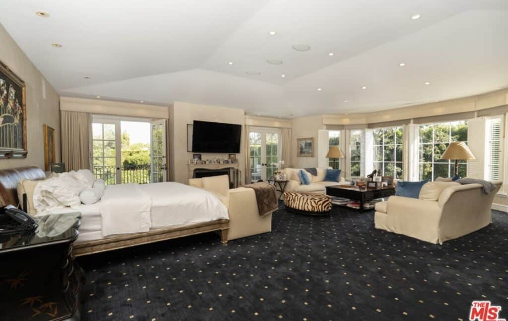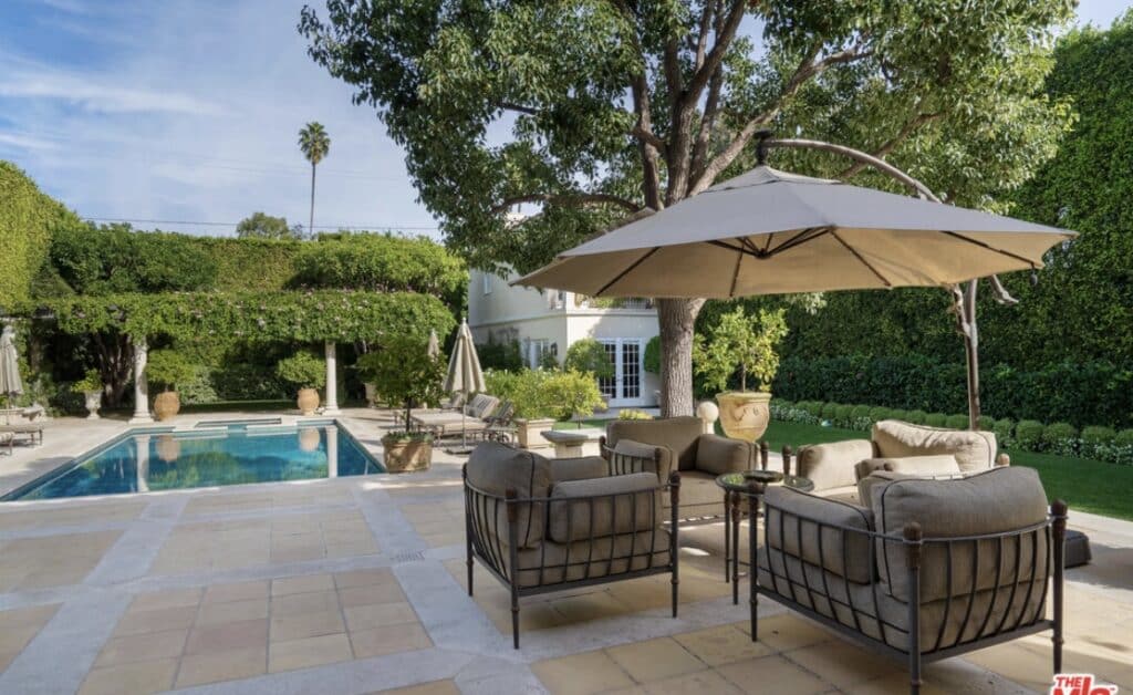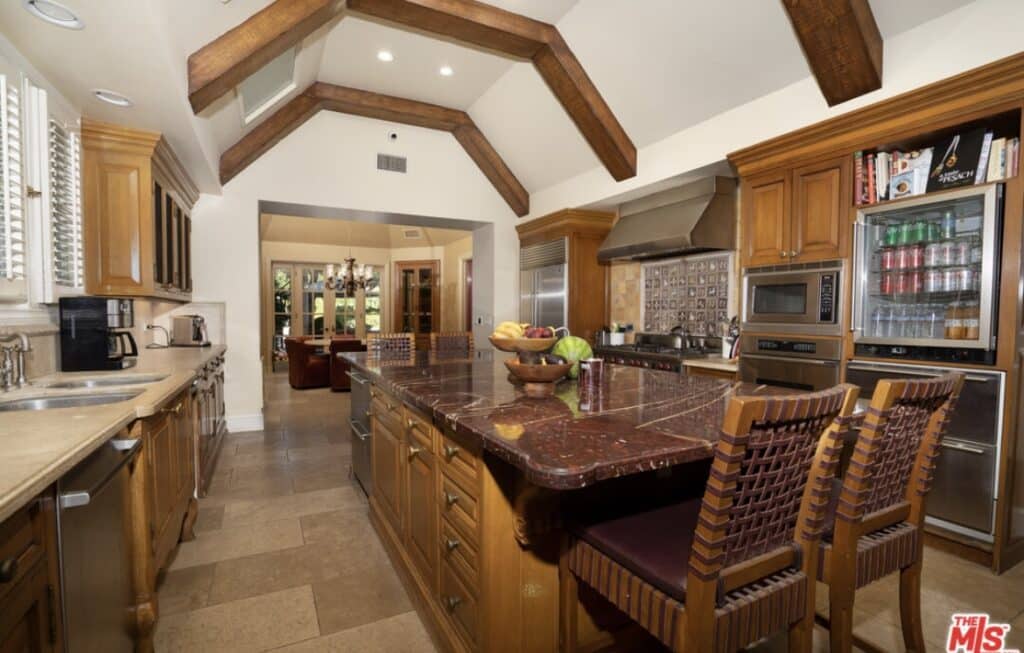 “Elegant Mediterranean-style villa is located in the coveted Beverly Hills flats. This flawless seven-bed, nine-bath family home boasts high ceilings, a grand entry with a dramatic circular staircase, imported Italian limestone flooring, a gourmet kitchen complete with high-end appliances, and a walk-in pantry. The massive primary suite is complete with double baths and designer closets. The pool is surrounded by park-like grounds and a two-story guest house.”