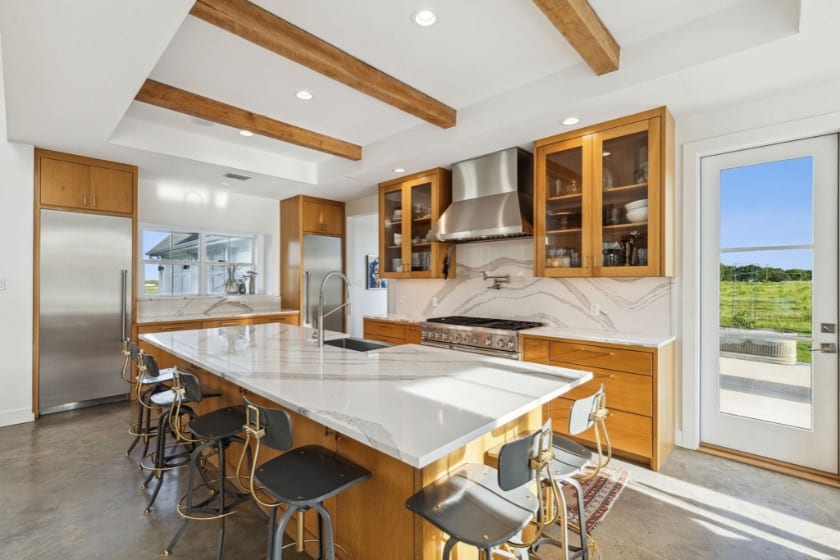 The current main house is 2,878 square feet and was built in 2017. It’s gorgeous, too. Lots of open, airy rooms, a downstairs primary retreat that opens to a screened-in porch with a fireplace, polished concrete floors in the main living, oak floors in the bedrooms, a killer pool out back, and views of nothing but Texas green grass, livestock if you choose to raise your own, the original barn, and a modern gazebo that offers outdoor dining on these delightful Fall days.